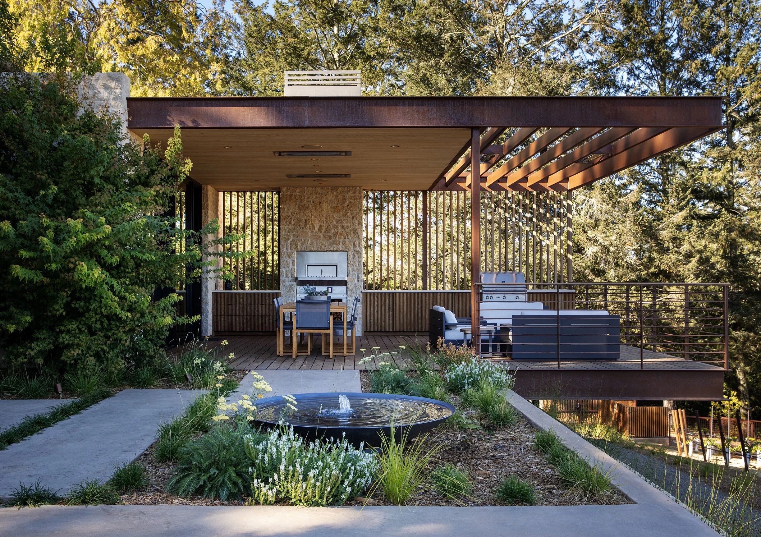The landscape is a tiered, multi-layered space - a series of outdoor terraces that step down the slope, connected by a mixture of pavers and gravel, and laced with dwarf mondo grass, miscanthus, cape rush and yarrow. These pockets of experience - dining pavilion, a bubbling fountain, a fire pit surrounded by a set of casual chairs, a bocce court below that doubles as a flexible space for parties - are at once individual and part of a calming collective whole. They are this project’s secret sauce.